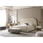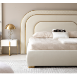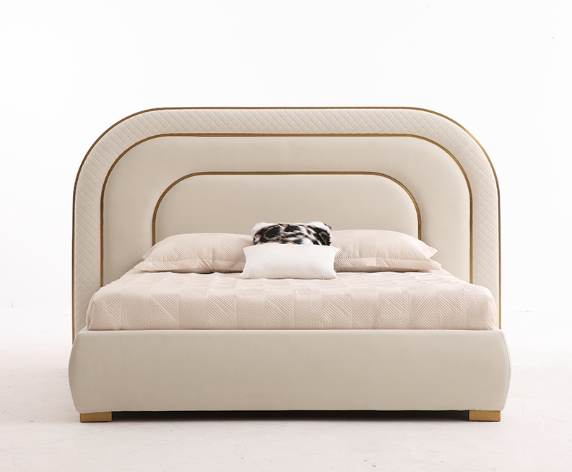 The Classic Modern King Bed with Mattress, featuring a plush, padded headboard with a unique, layered, arched design, covered in soft beige upholstery and accentuated with golden frame accents for a touch of opulence and modern elegance. |