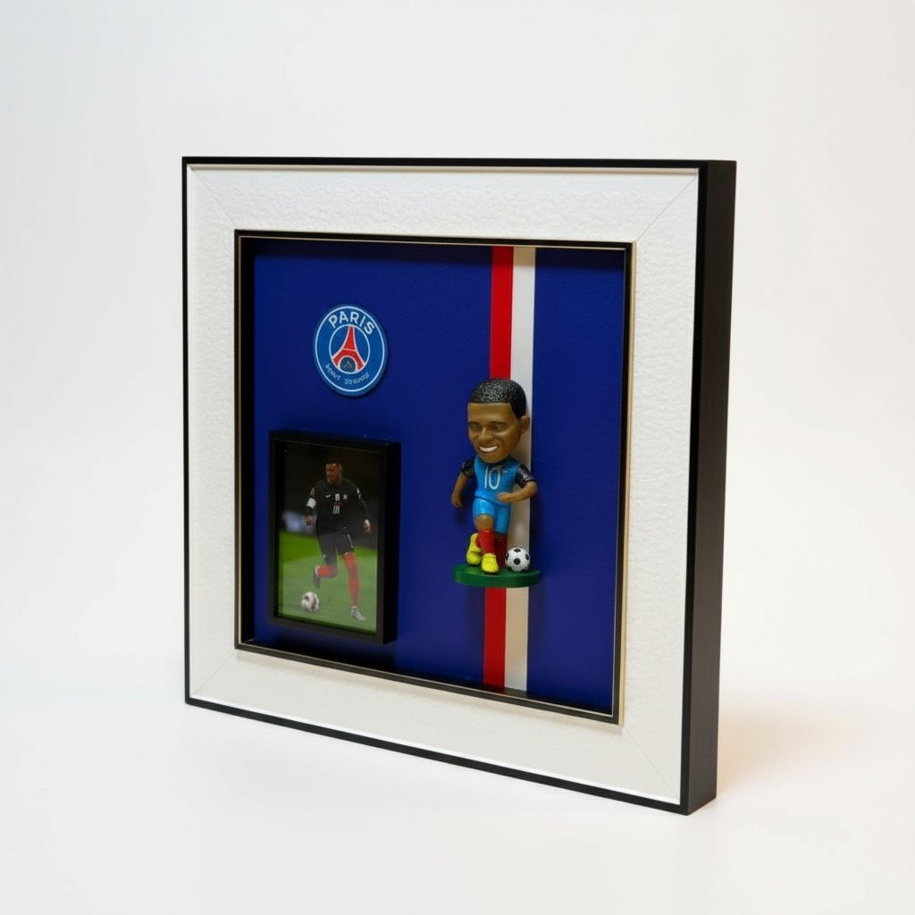 The display features Kylian Mbappé, with a white frame made of wood or MDF, a clear acrylic or glass front, and a PVC or resin bobblehead with a spring-mounted head. |
