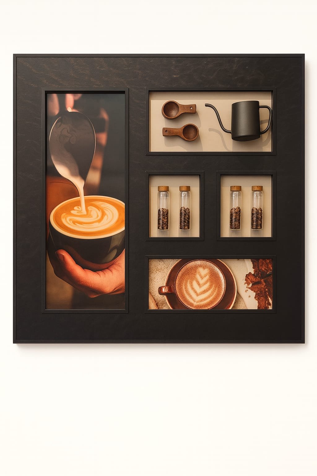 The Coffee Art wall collage showcases barista tools and espresso gear, with a wooden and black leather frame and the accessories made from stainless steel, wood, and coffee bean glass for a realistic look.