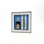 The shadow box frame commemorates Lionel Messi and Argentina’s 2022 World Cup win, featuring a PVC or resin bobblehead with a spring-mounted head.