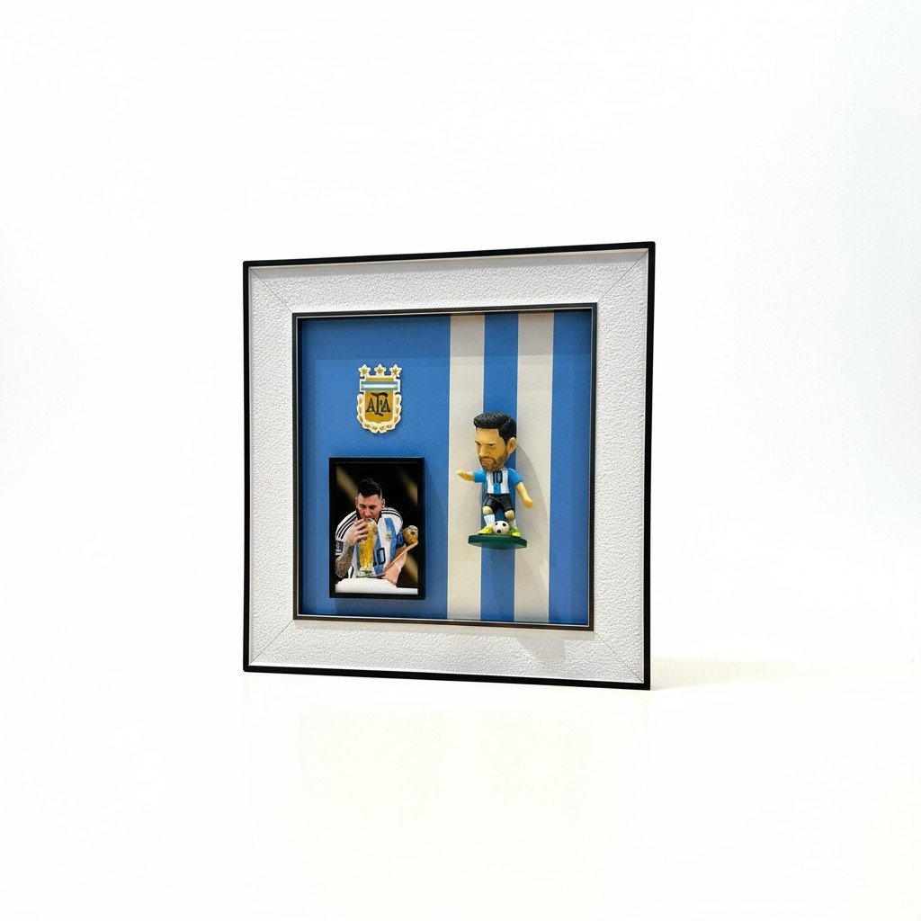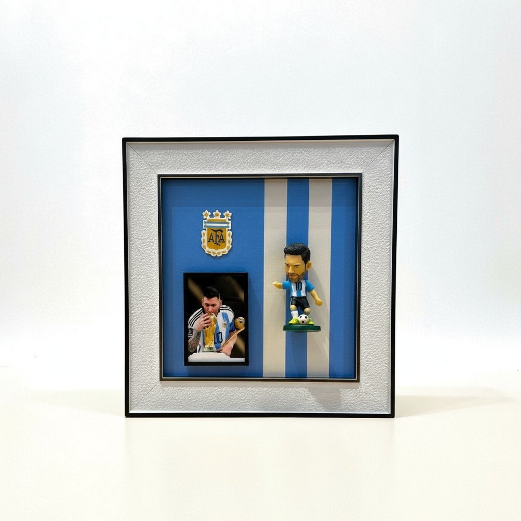 يُخلّد إطار صندوق الظل ذكرى فوز ليونيل ميسي والأرجنتين بكأس العالم 2022، ويتميز برأس متأرجح مصنوع من مادة PVC أو الراتنج مع رأس مثبت بنابض.