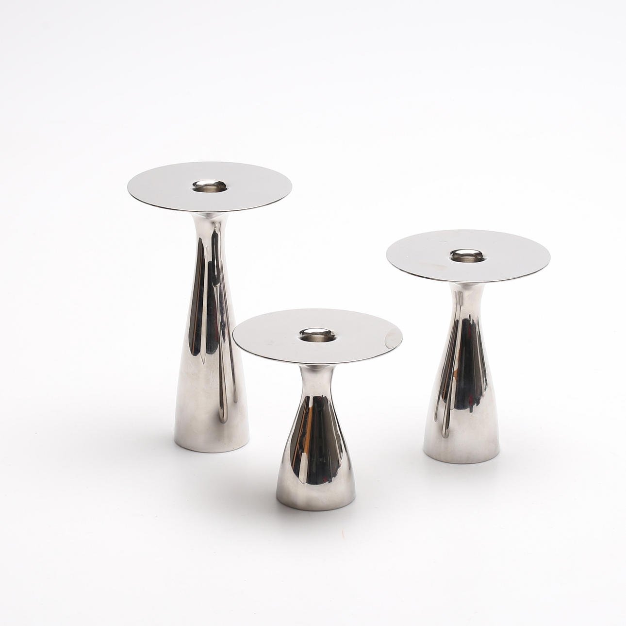 The candle holders are crafted from highly polished, mirror-finish stainless steel, which elegantly reflects the light of a flickering candle. |