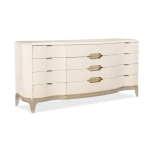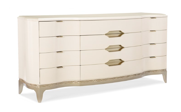 This twelve-drawer triple dresser combines solid birch and engineered maple, with metal soft-close glides, curving neoclassical lines, astroid-shaped inset handles, a carved ribbon base, a jewel tray in the top right drawer, and white-painted interiors. |