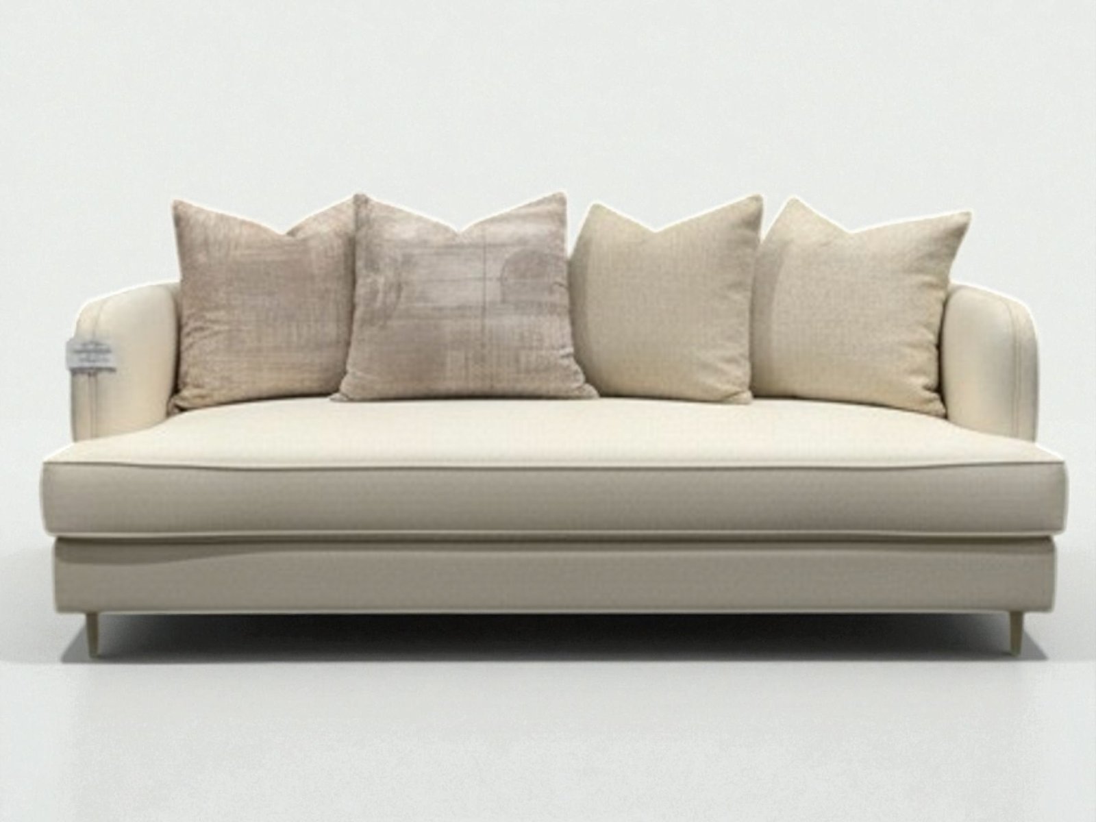 This Classic modern sofa features clean lines, neutral beige upholstery, and distinctive curved armrests with grooved detailing. Built on a sturdy wood frame with high-density foam cushions, it typically includes tapered metal or wooden legs. |