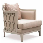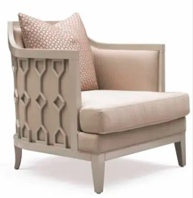 كرسي أريكة كلاسيكي عصري بإطار خشبي مثقوب منحوت يدويًا باللون الفضي الناعم أو الذهبي الشامباني أو الكراميل اللامع، ويتميز بإسفنج عالي الكثافة ووسائد زنبركية مغطاة بمزيج فاخر من البوليستر/الرايون.