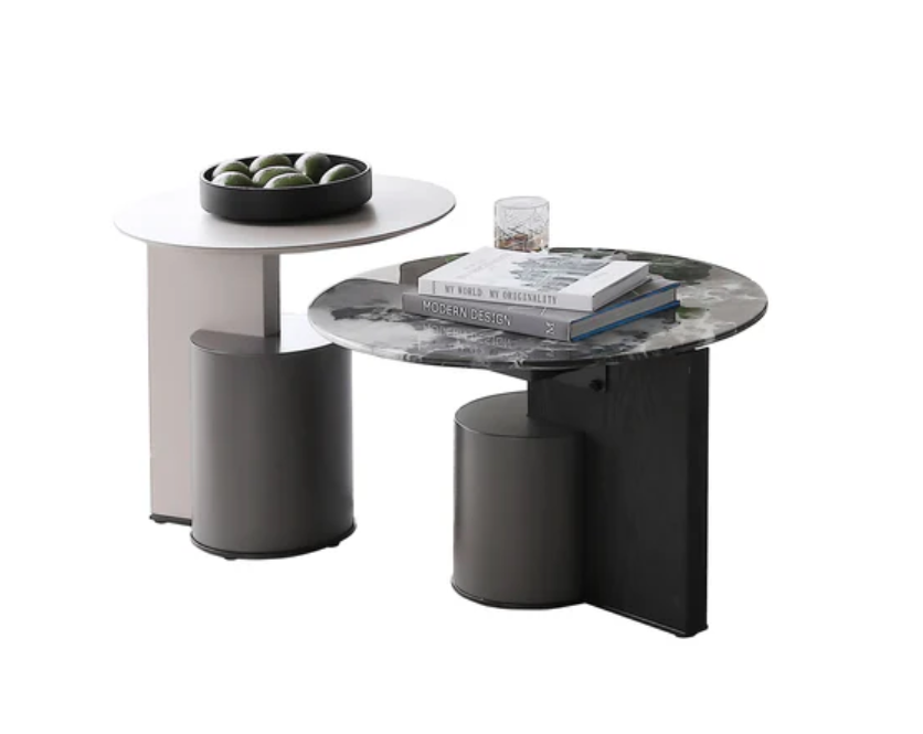The set includes two tables with asymmetrical, overlapping designs and a modern aesthetic, often featuring a marble-finish top and a solid base. They are considered an elegant addition to any living space, offering both luxury and style. |