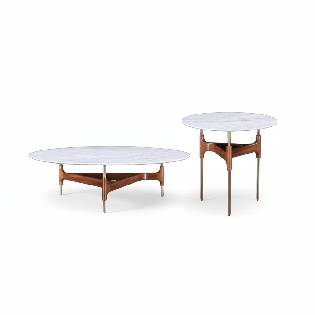 Coffee & Side Table White Marble with Walnut and Metal Frame طاولة قهوة وطاولة جانبية من الرخام الأبيض مع إطار من خشب الجوز والمعدن