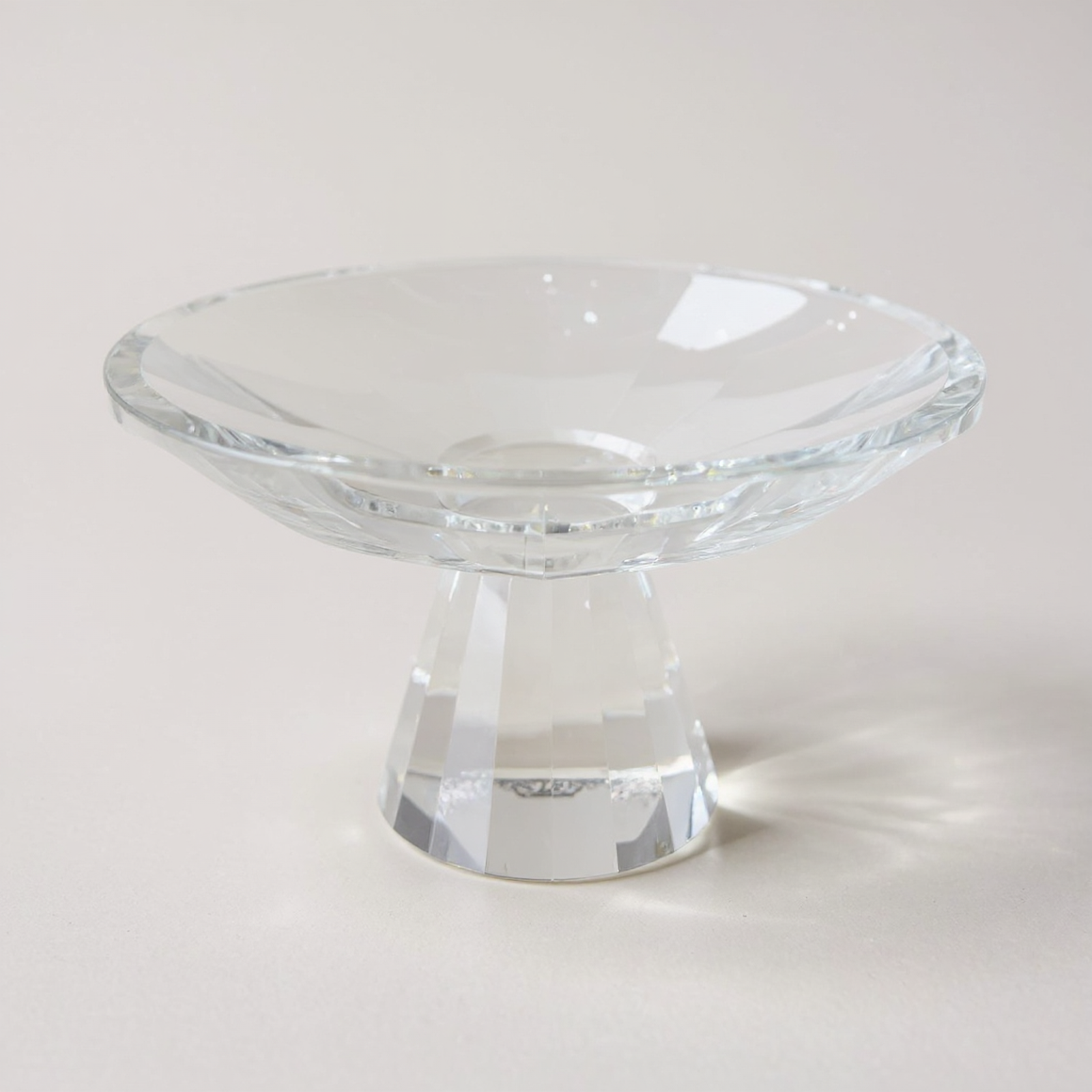 Crafted from fine, hand-cut crystal, the design is intended to capture and reflect light. The image is entirely clear crystal. Other variations may include a slender band of brown-hued crystal defining the transition between base and bowl. |