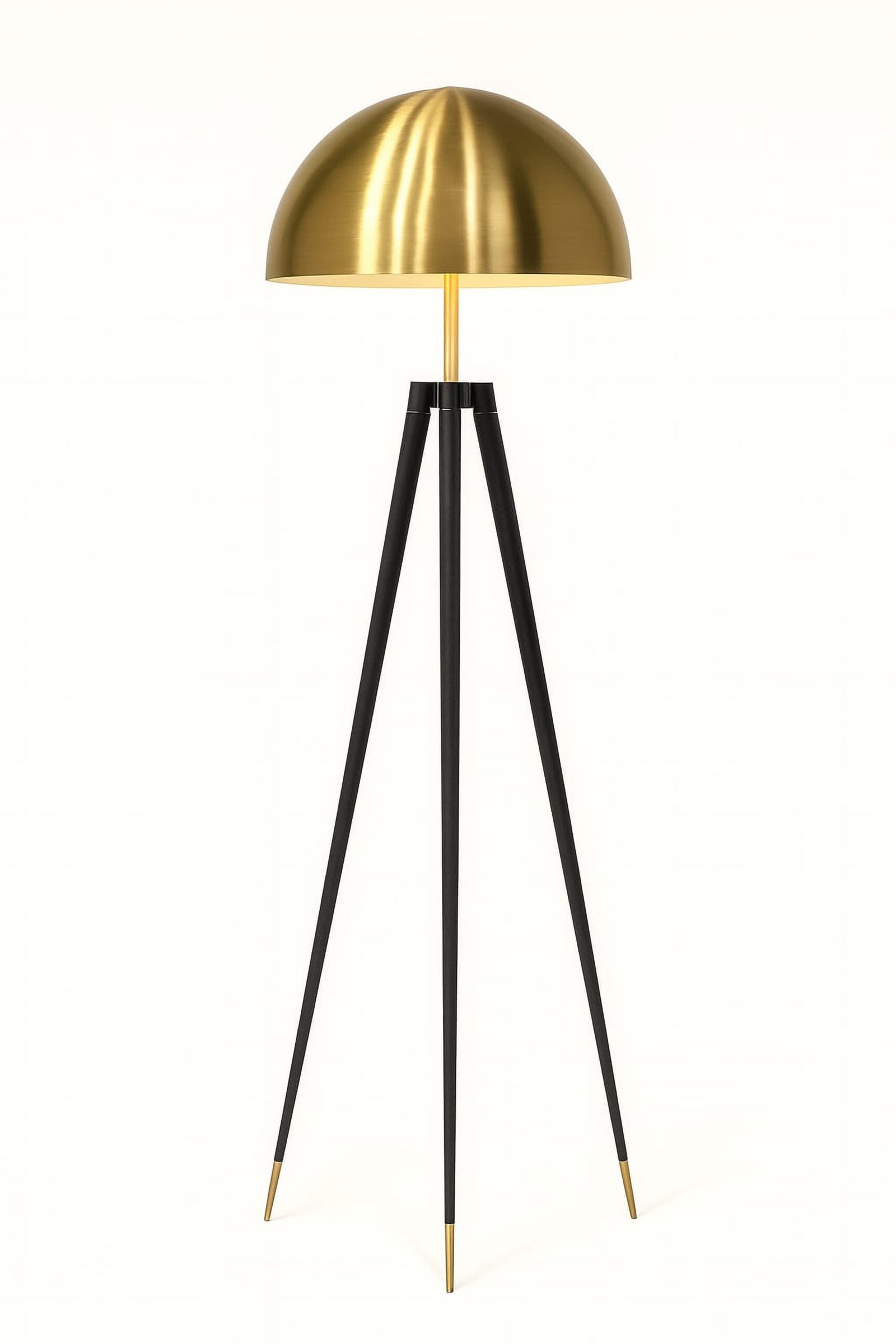 It is typically constructed from metal, with the dome shade finished in a brass or gold tone, and the tripod legs in a matte black finish with small gold caps at the feet. |