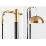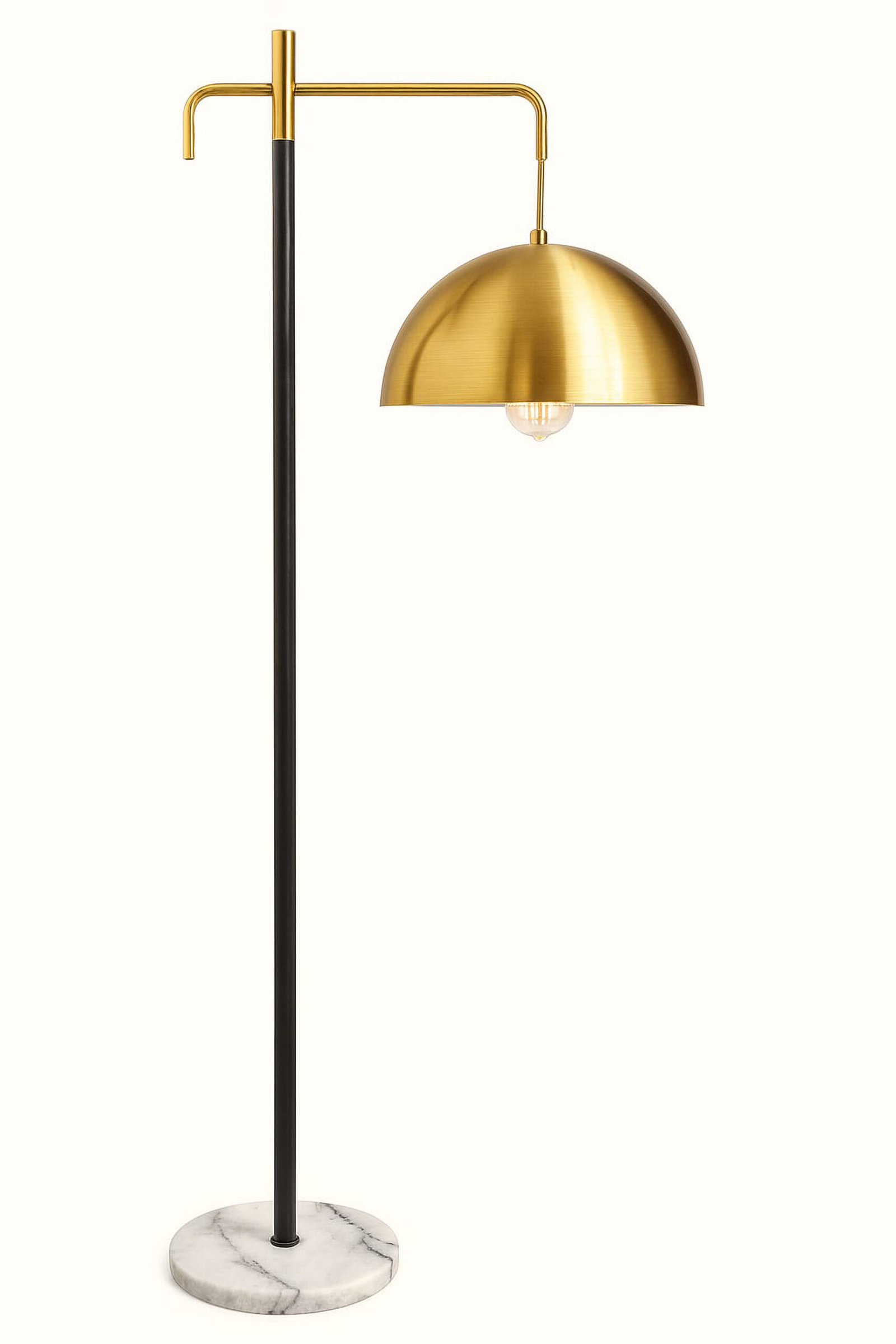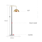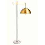 It is typically constructed with a genuine or faux white marble base for stability and weight, a black metal vertical pole, and gold/brass-tone metal accents and a dome-shaped shade. |