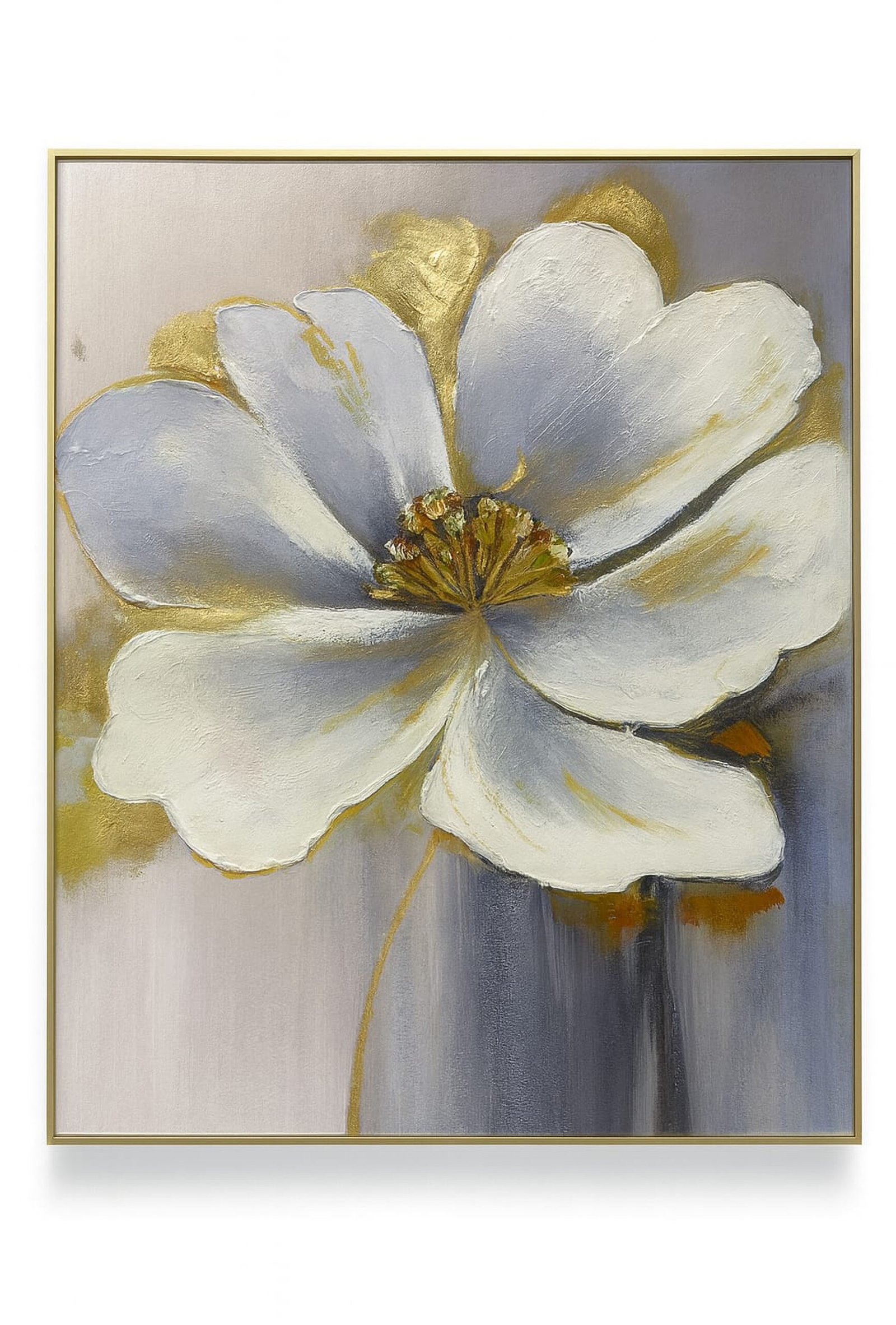 Hand-painted oil on canvas +Metal frame white and gold grey flower لوحة زيتية مرسومة يدويًا على قماش + إطار معدني، زهرة بيضاء ورمادية ذهبية