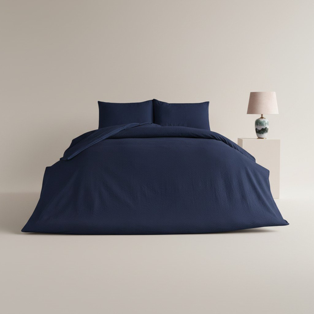 طقم مفارش سرير من القطن 100% بنسيج وافل بتصميم بسيط وأنيق. مناسب لمراتب بمقاس 140–160 × 200 سم. سهل العناية: يُغسل عند 30 درجة مئوية، بدون استخدام مبيض، لا يُجفف في المجفف، يُعلّق ليجف، ويُكوى بحرارة متوسطة عند الحاجة.