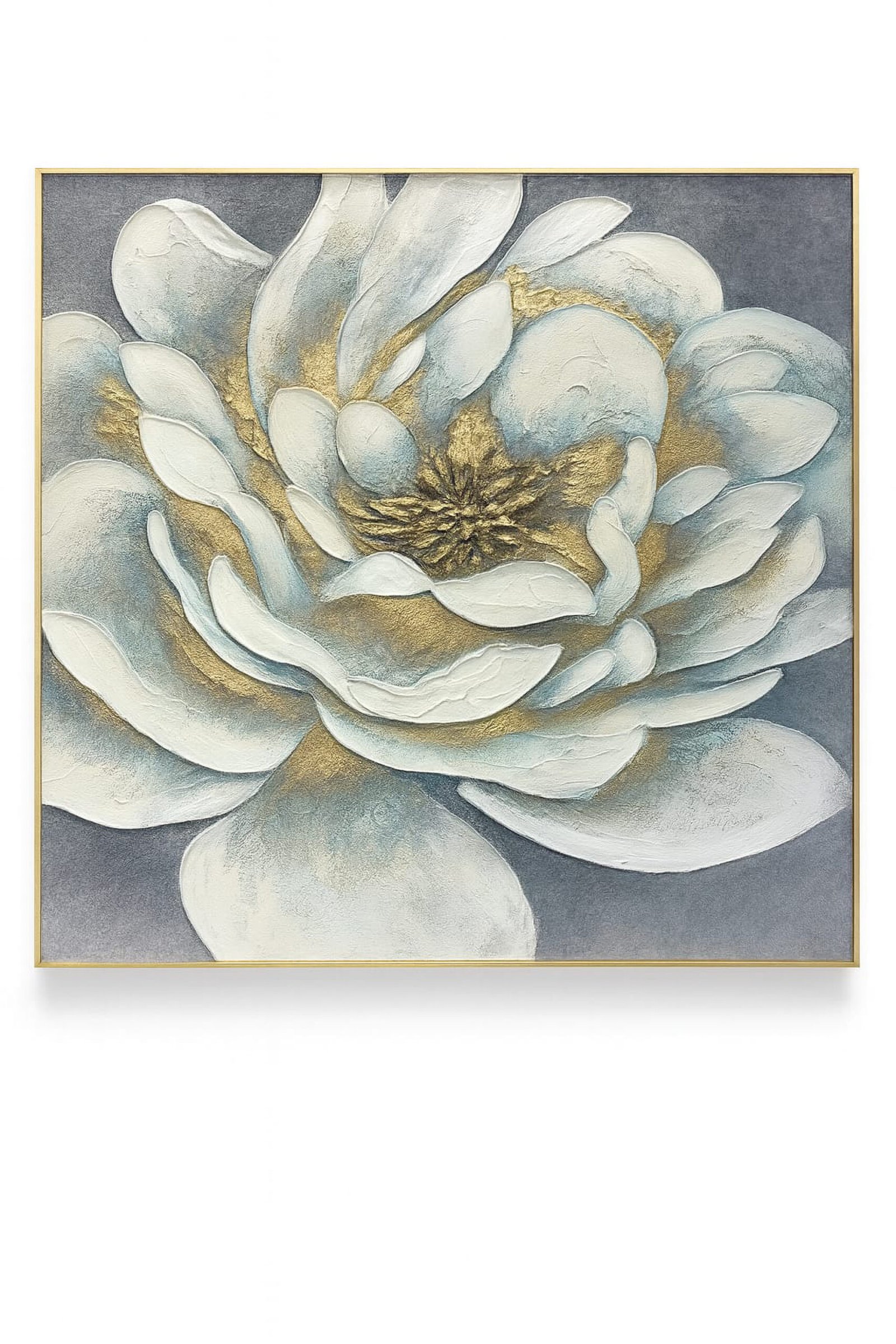 Hand-painted oil on canvas +Metal frame gold and white flower لوحة زيتية مرسومة يدويًا على قماش + إطار معدني بزهرة ذهبية وبيضاء