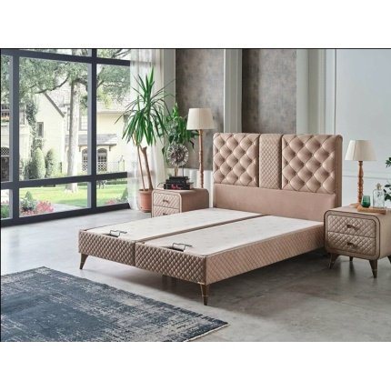 The Grand Ottoman Bed features a fabric-lined exterior over a durable electrostatic painted metal frame and wooden-lined metal skeleton, offering a large upholstered headboard and hydraulic storage space |