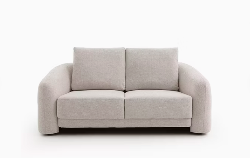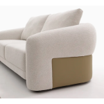 أريكة بإطار من خشب الصنوبر الصلب وأرجل مزدوجة من المعدن والبلاستيك لمزيد من الثبات. مُنجّدة بقماش بوليستر ناعم يسمح بمرور الهواء أو قماش بوكليه محكم، مع وسائد من إسفنج عالي الكثافة، وتتميز بألواح سفلية متباينة من جلد صناعي يشبه الجلد لإضفاء مظهر أنيق بلونين.