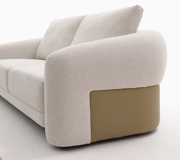 Sofa with a solid pine wood frame and dual-material metal/plastic legs for stability. Upholstered in soft, breathable polyester or textured bouclé, with density foam cushions, and featuring contrasting lower panels in leather-like PU for a sophisticated two-tone look.