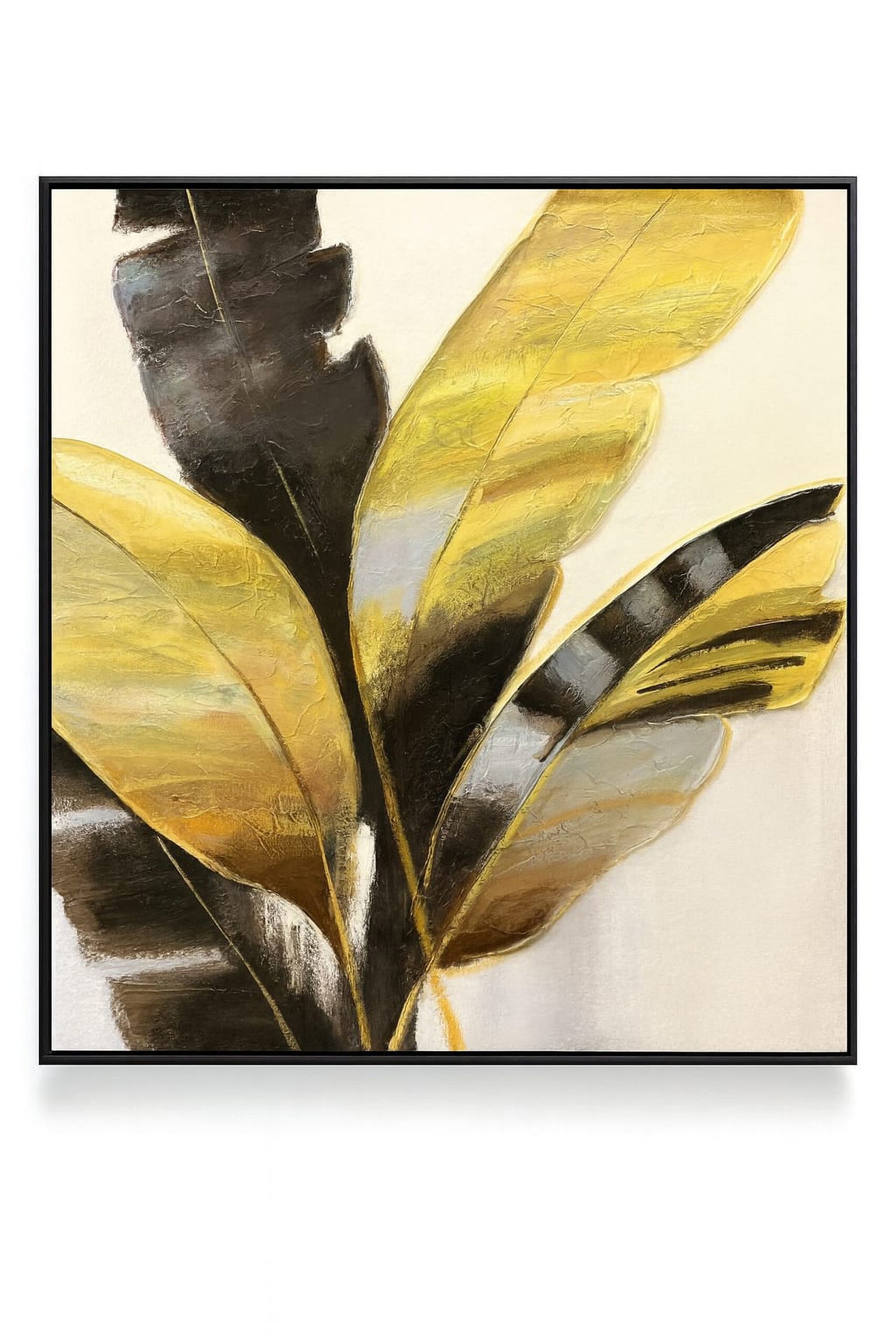 It is created using professional-grade oil and/or acrylic paints with thick textures to give the leaves a raised appearance [1.2, 1.3, 1.13]. The metallic veins are achieved using real or imitation gold leaf or metallic pigments [1.2, 1.9]. The frame is typically made of aluminum or a similar metal alloy. |