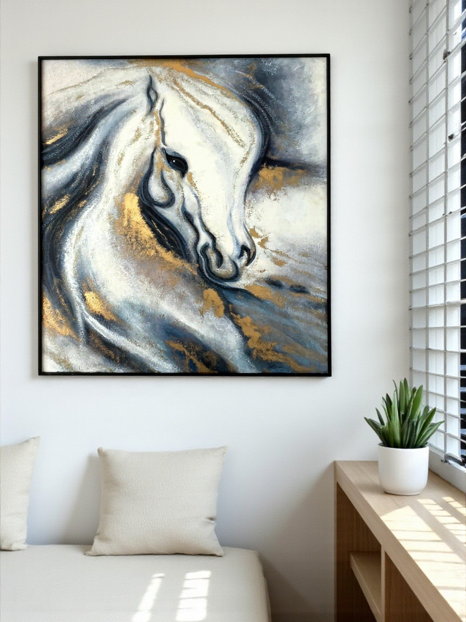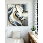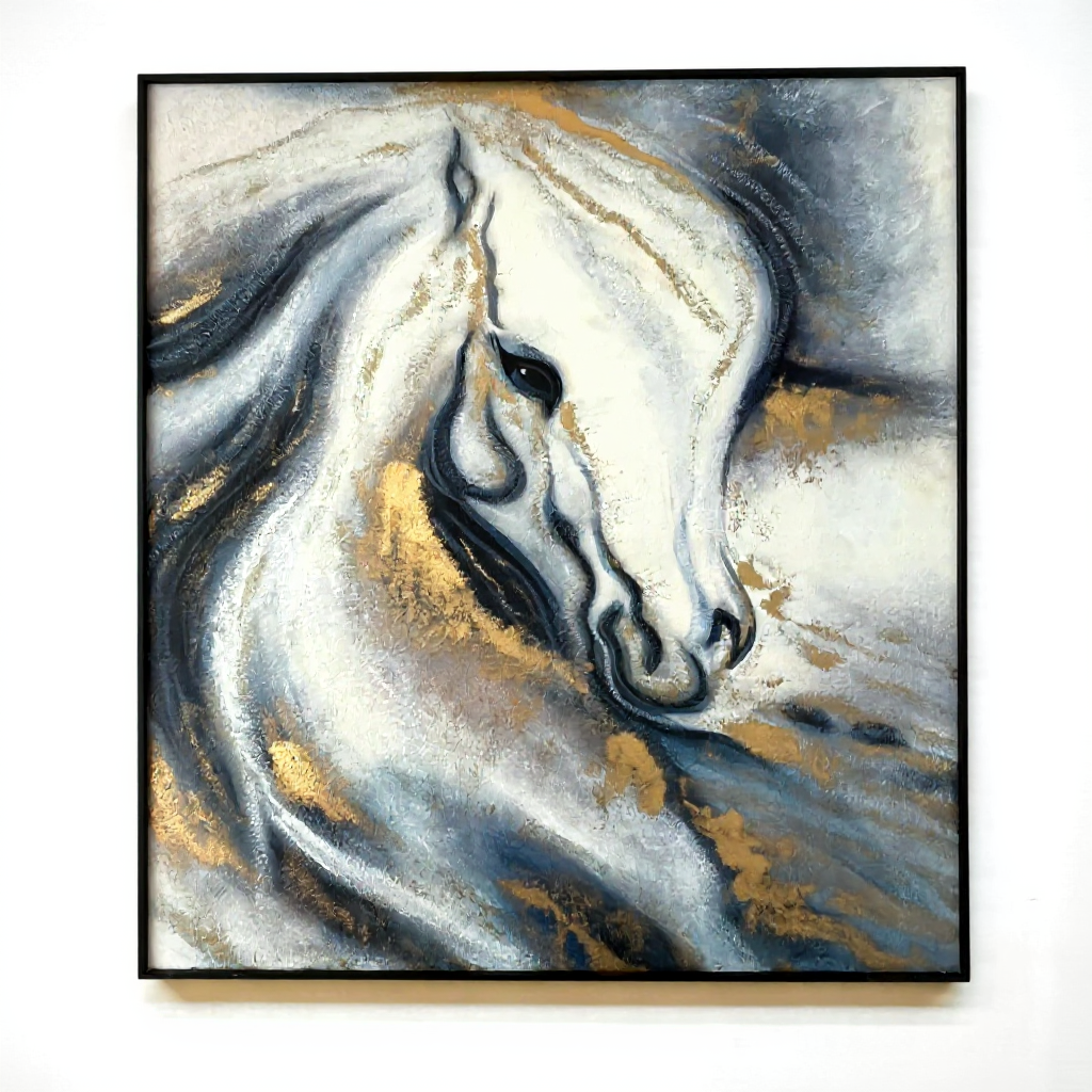 Hand-painted oil on canvas +Metal frame white and gold horse لوحة زيتية مرسومة يدويًا على قماش + إطار معدني لحصان أبيض وذهبي