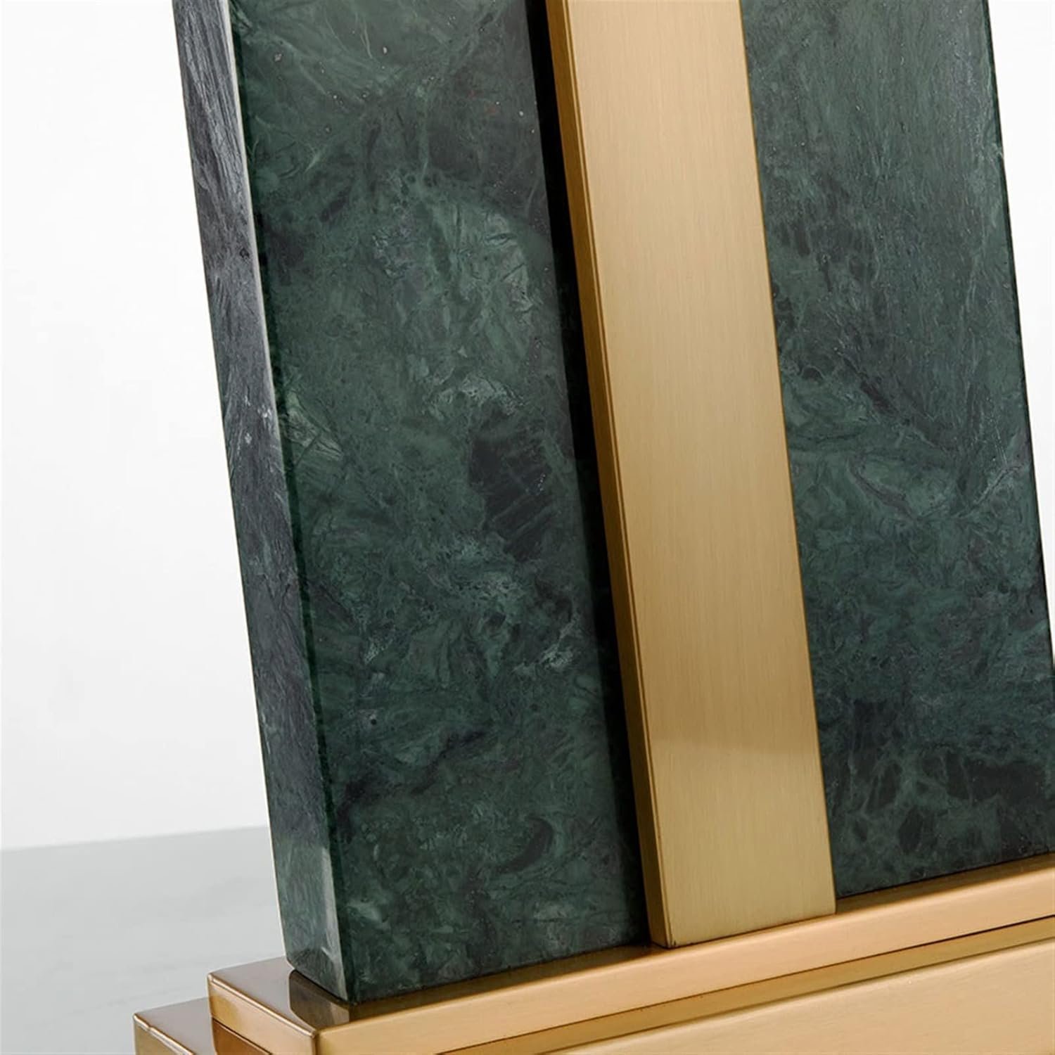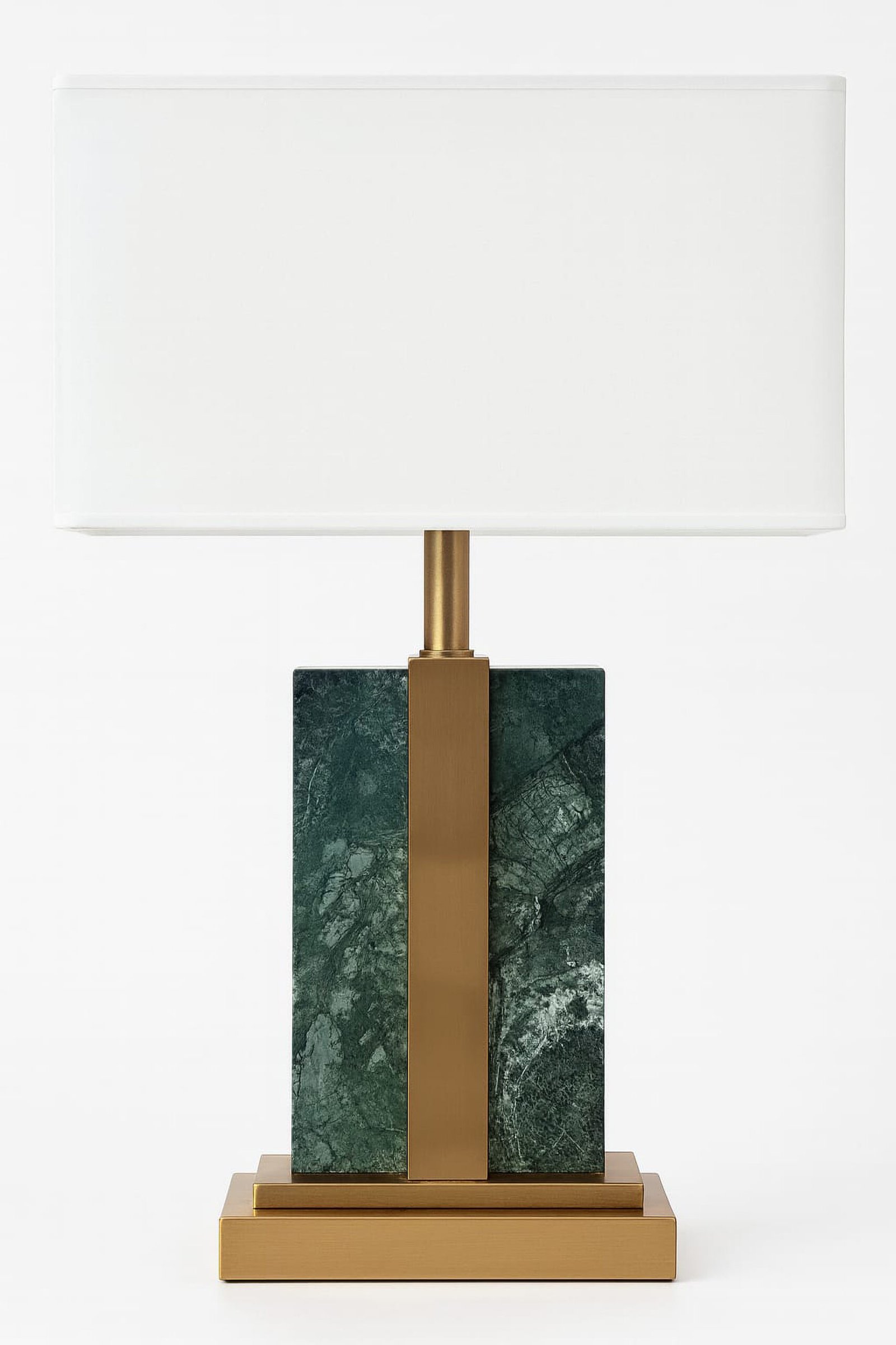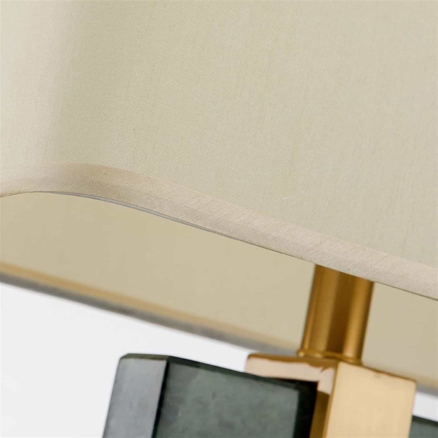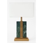 It is constructed from a genuine or faux green marble base and metal components finished in a gold or brass tone. The shade is a hardback fabric drum, typically in an off-white or beige color. |