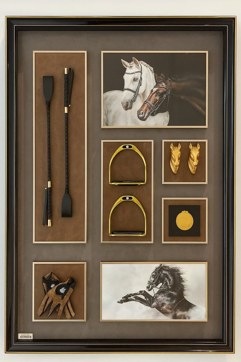 صُنعت هذه العلبة الظلية ذات الطابع الفروسي بإطار من الخشب الصلب، وخلفية من المحتمل أن تكون مصنوعة من الجلد البني أو مادة الجلد الصناعي، وتتميز بإكسسوارات ركوب الخيل الواقعية مثل السياط والقفازات الجلدية، والركائب المعدنية، وخطافات رأس الحصان المصنوعة من الراتنج، والصور الورقية.