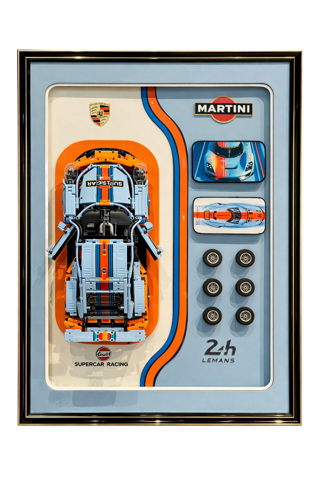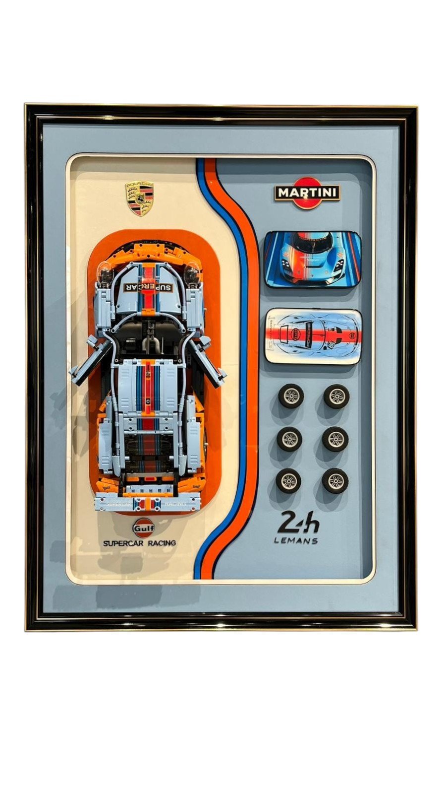 يتميز نموذج بورش 911 المصنوع من الليغو، والمصمم على شكل سيارة سباق "مارتيني غلف"، بخلفية مطبوعة خصيصًا مع ألوان السباق، مما يحول النموذج إلى قطعة فنية لافتة للنظر.