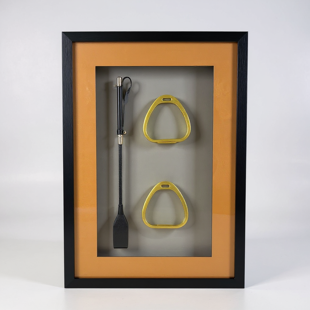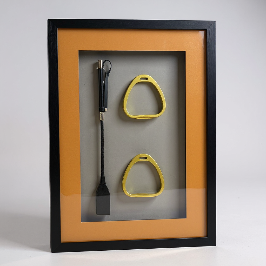 This shadow-box art frame is crafted with a solid wood or MDF frame and glass cover, featuring real equestrian items including a riding crop and metal stirrups mounted on a layered matte backing for a clean, premium display.