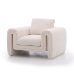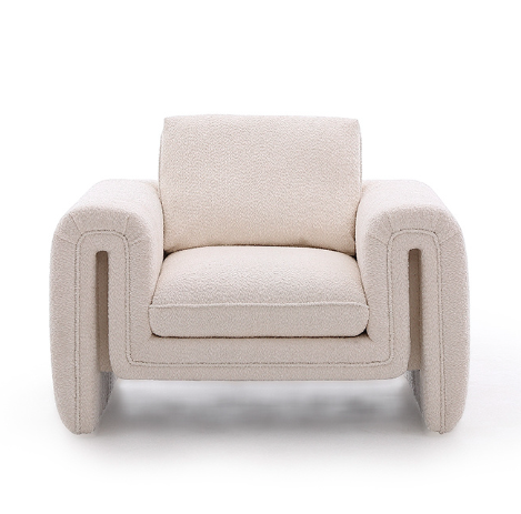 A sculptural armchair with a continuous, flowing base and armrests, finished in soft bouclé or chenille fabrics in neutral tones. Features a deep seat, integrated cushions, and high-density foam over a sturdy birch or oak frame for lasting comfort and durability. |