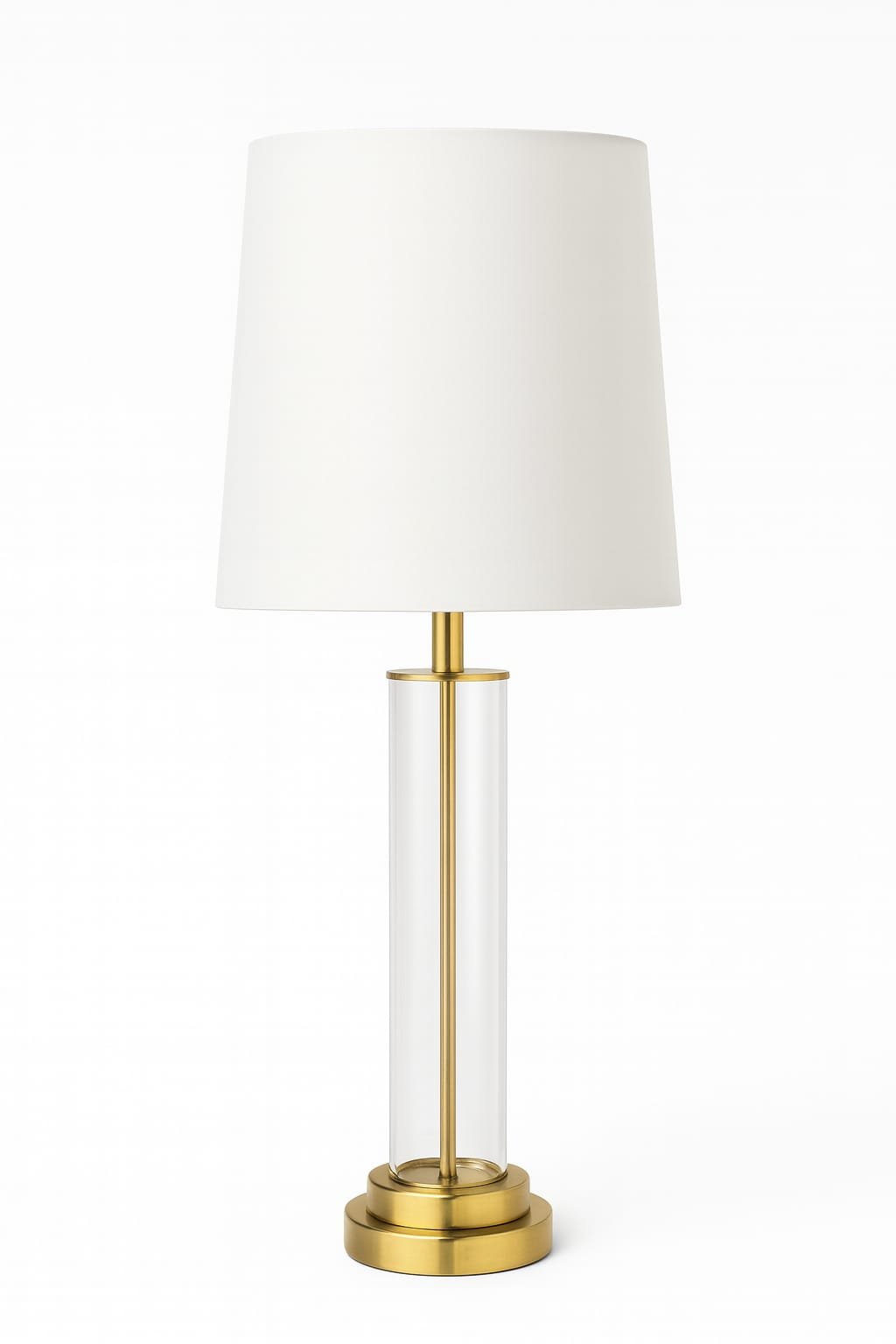 It is made of glass and metal components finished in a brass-tone, topped with a hardback fabric drum shade, typically in white or a natural color. |